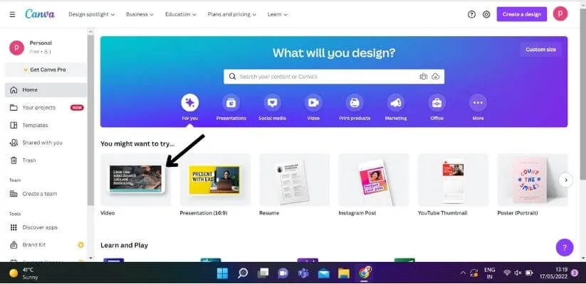 If you are alreadyloggedin, select theVideotemplateor any othertemplateyou want.